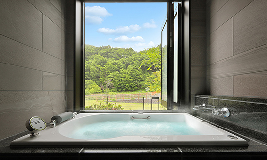 1階には温浴後の水風呂としてもご利用いただける景色に面した内風呂もご用意しております。窓を全開にすれば、露天風呂のような開放感も思いのままに。