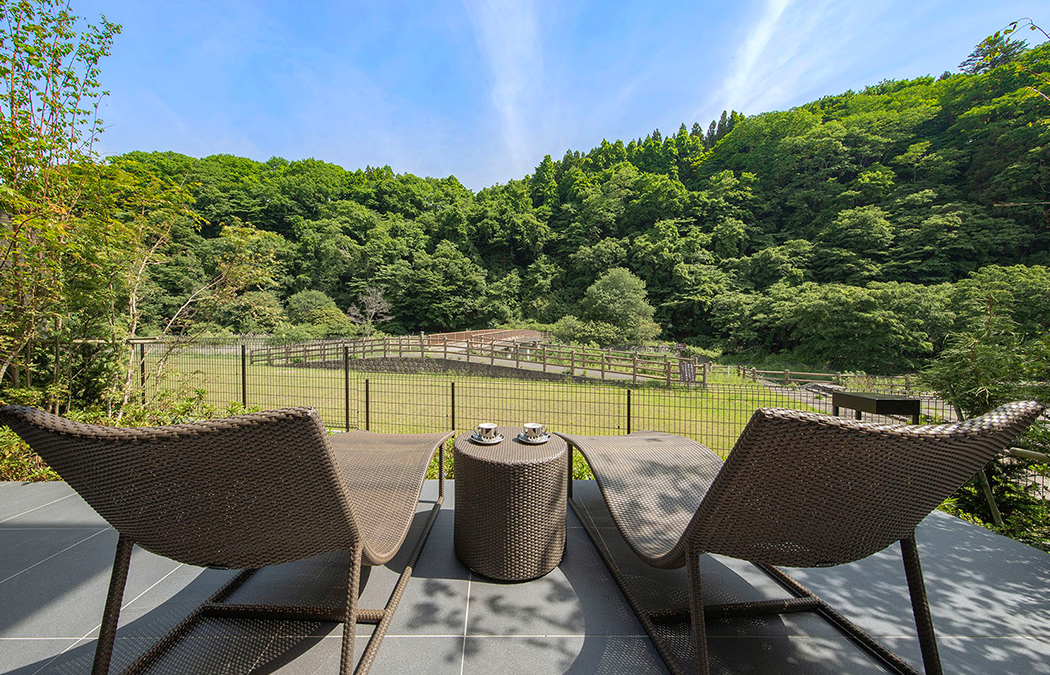 ヴィラ内の専用施設としては珍しく、源泉掛け流しの客室露天にプライベート岩盤浴ブースという、2つの温浴施設を完備した「紅葉 KUREHA」。