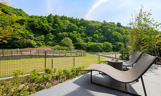 サウナや岩盤浴で体の芯から温まった後は、箒川のせせらぎと山の景色を独り占めできる1階のテラスでの外気浴はいかがでしょうか。1階の内風呂と併せ、自分だけの「ととのい」ルーティンを組み合わせて楽しめる自由度の高さも「紅葉 KUREHA」ならではの魅力のひとつ。